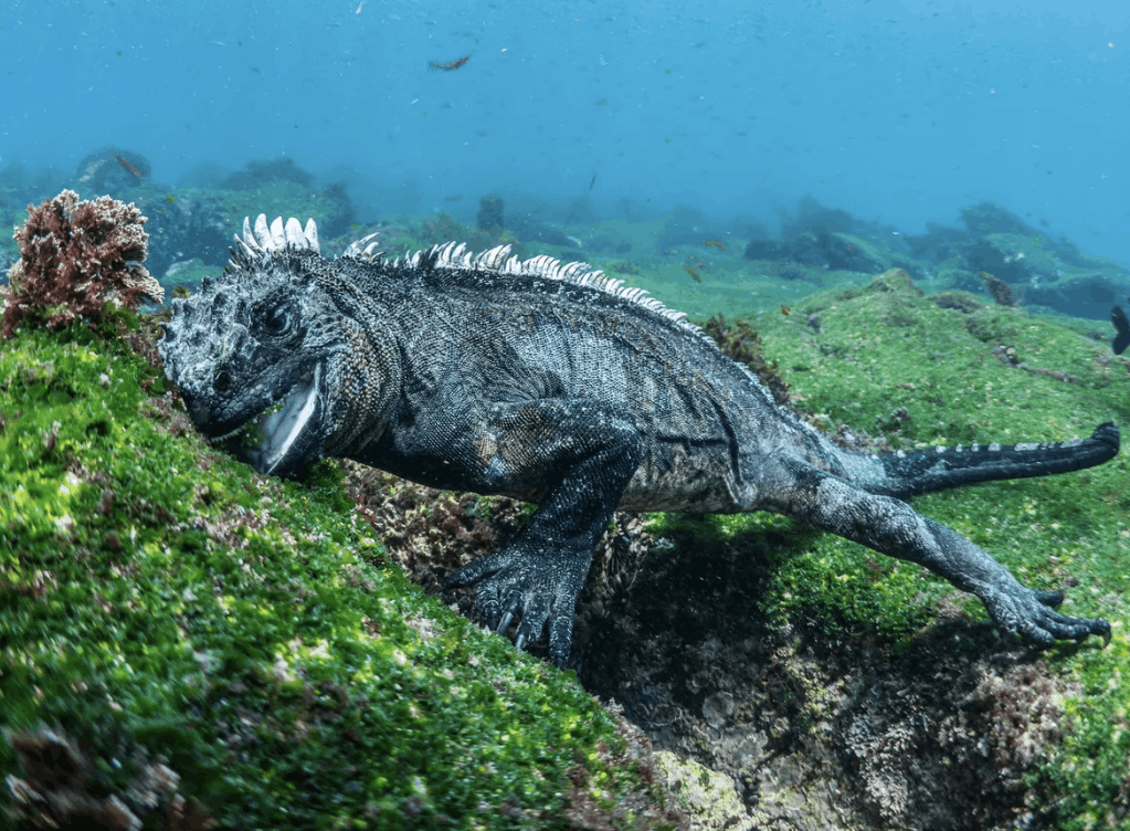 Unlike most lizards that stick to land, marine iguanas regularly swim out to feed on algae that grow on rocks in the sea. Larger individuals may travel farther from shore and cling to underwater surfaces with sharp claws while grazing. Because the algae and seawater contain so much salt, they rid themselves of the excess by sneezing salty crystals from special glands near their noses.