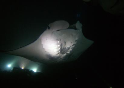 We went into the water as it got dark. They had a pot of lights on the bottom lighting up a column of water. The column was full of sea life. We went to the bottom and shone our lights up as well, the mantas came swooping in like Klingon Battle Cruisers, was awesome. The wash as they wheeled about pushed us around. Did a short night dive after about 30 minutes of watching the mantas.
